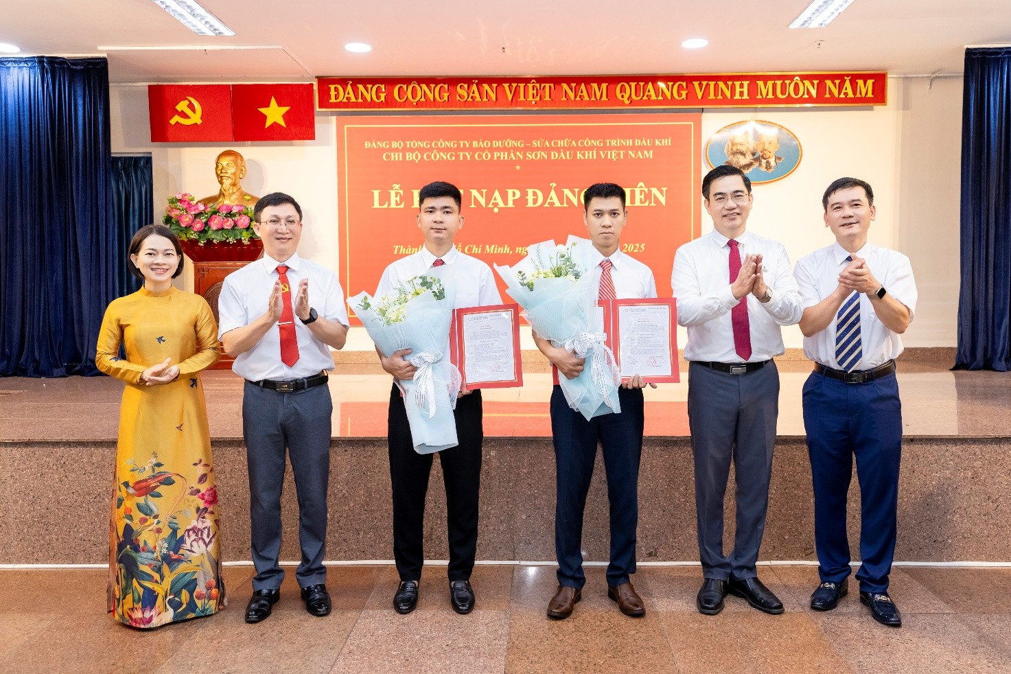 Đồng chí Nguyễn Đức Tuấn cùng các đồng chí lãnh đạo PVMR và PVPaint trao các quyết định kết nạp đảng viên và tặng hoa cho 2 quần chúng ưu tú